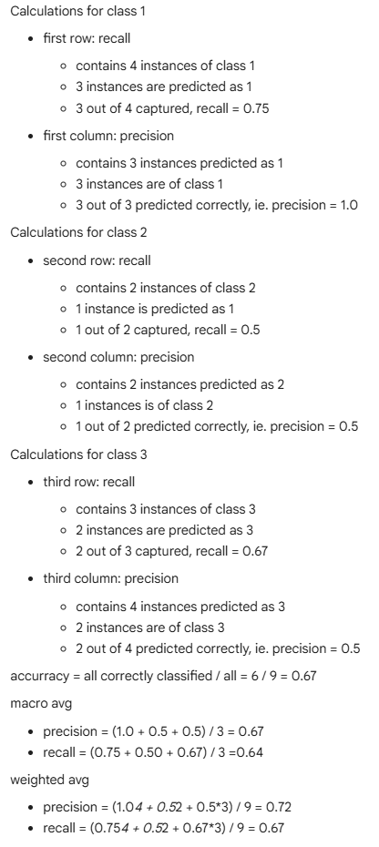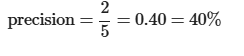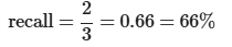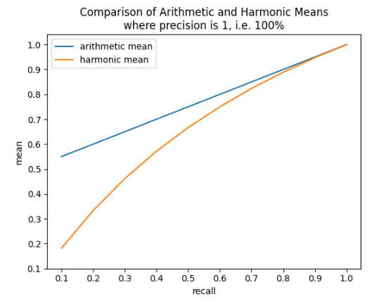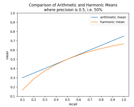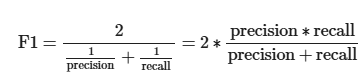 - Precision of 100% and recall of 1% would lead to F1 of 50.5%