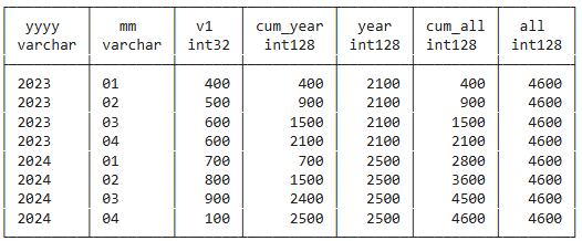 sum(v1) over (partition by yyyy order by mm) as cum_year,