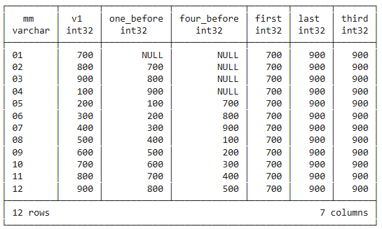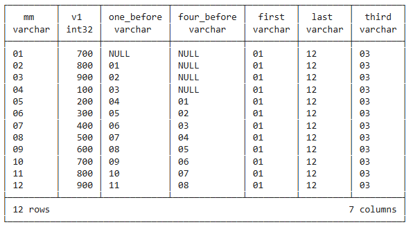 lag(v1, 4) over (order by mm) as four_before,