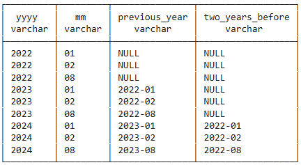 over (partition by mm order by yyyy, mm) as two_years_before
