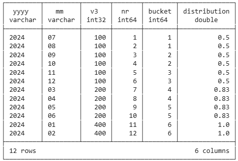 ntile(6) over (order by v3) as bucket,